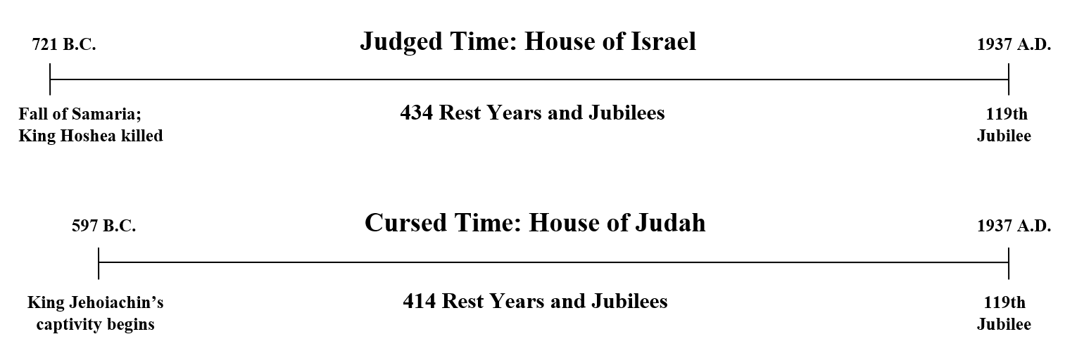 As we saw in earlier chapters, Samaria, the capital of the northern House of Israel, fell to the Assyrian army in 721 B.C. King Hoshea of Israel was captured and was presumably killed. From that point in time to the year 1937 A.D. includes precisely 434 rest years and Jubilees.